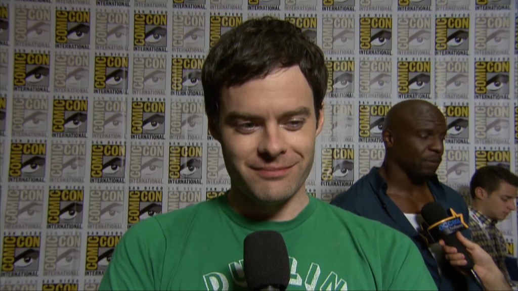 Bill Hader is on the red carpet talking about boys and girls at Comic-Con promoting the new animated sequel “Cloudy with a Chance of Meatballs 2”.