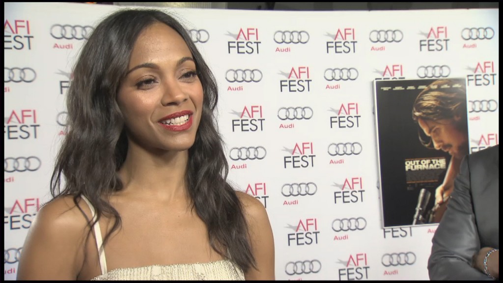 A radiant Zoe Saldana appeared in a light colored dress on the red carpet at the AFI Film Fest to talk about her starring role in “Out Of The Furnace”.