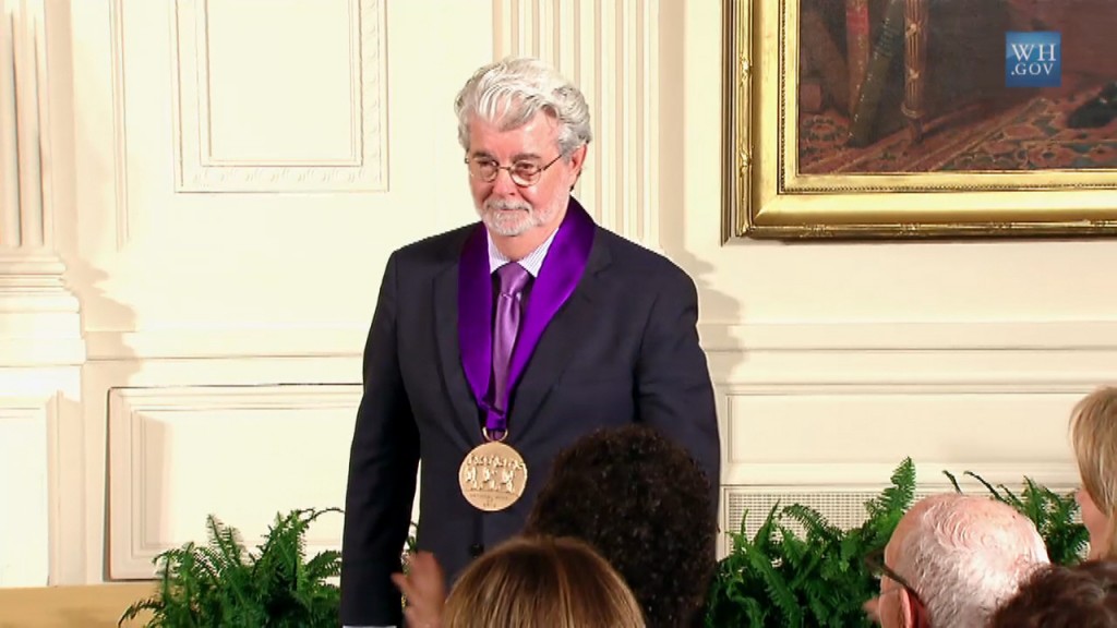 President Obama awards the National Medal of Arts and National Humanities to filmmaker George Lucas in a ceremony in the East Room of the White House.