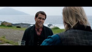 Colin Farrell (Pádraic Súilleabháin) has a chat outside a bar with Brendan Gleeson (Colm Doherty) about their friendship in “The...
