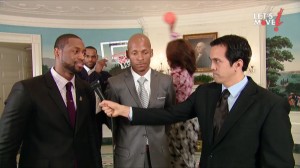 LeBron James, Dwyane Wade, Chris Bosh, Ray Allen and coach Erik Spoelstra Join First Lady and supreme photobomb dunking champion...