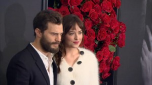 Dakota Johnson as Anastasia Steele and Jamie Dornan as Christian Grey and author E.L James as Producer in one of...